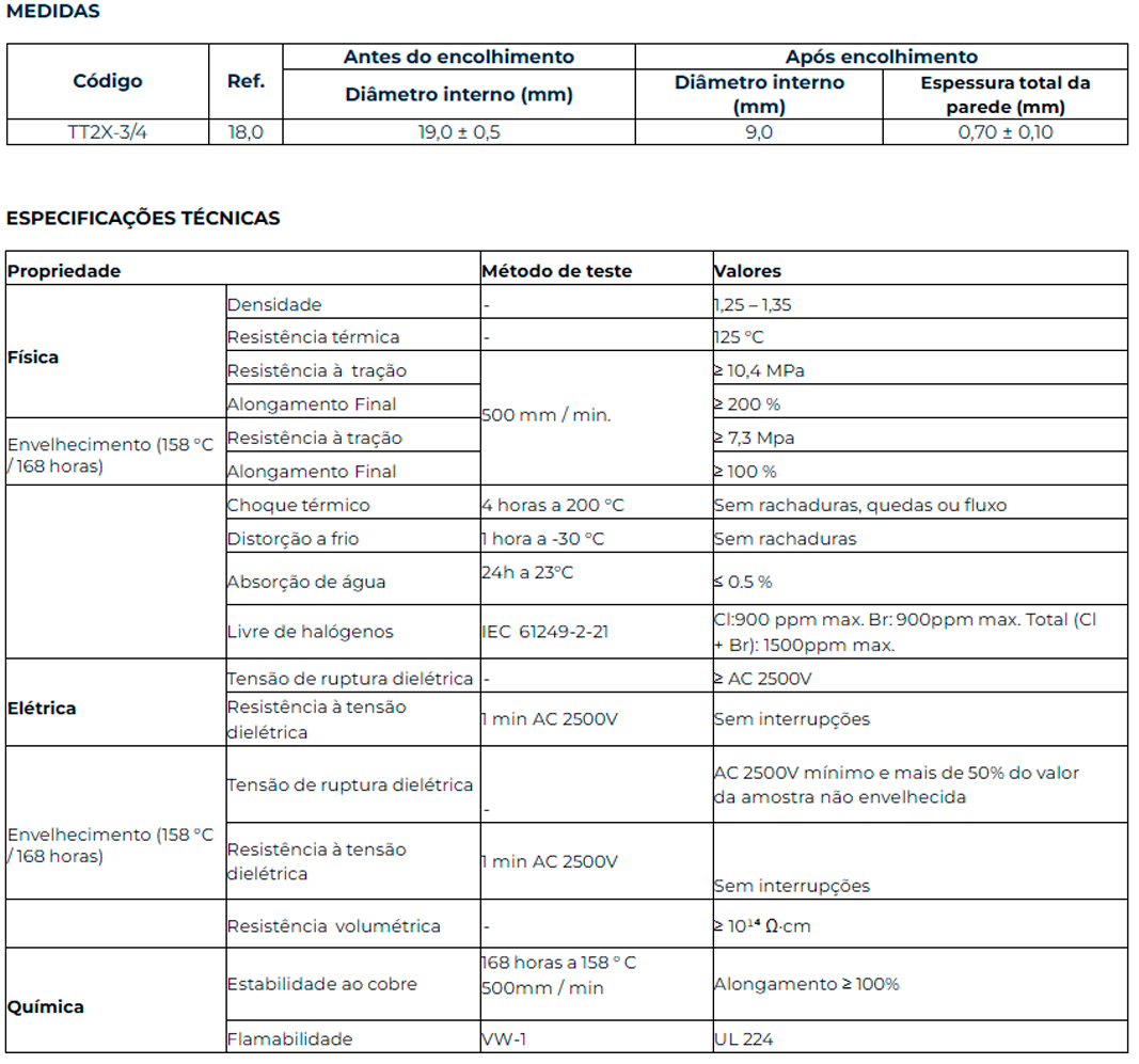 Termoencolhível livre de halogênio, resistente a solventes e fluidos químicos. Oferece excelente isolamento e proteção em ambientes exigentes, com taxa de encolhimento de 2:1.